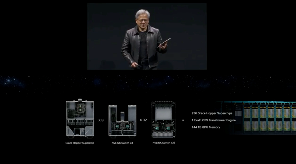 首先来看下英伟达今日推出的采用英伟达最新GPU和CPU的系统巅峰之作——新型大内存AI超级计算机DGX GH200。