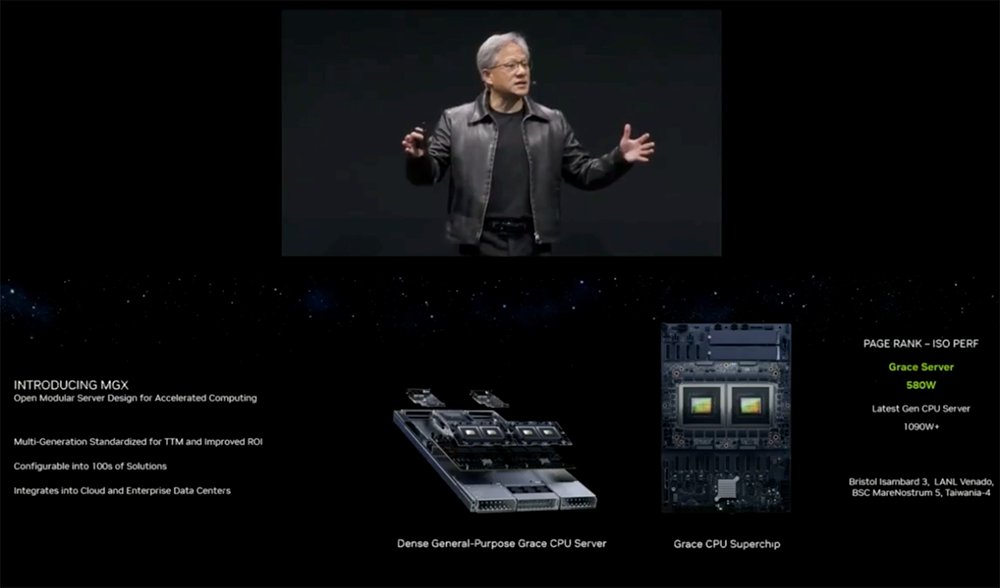 为了满足各种规模的数据中心的需求,黄仁勋发布了NVIDIA MGX服务器规范,为系统制造商提供了模块化参考架构。系统制造商可使用它快速且经济高效地构建100多种服务器配置,以适应广泛的AI、HPC及NVIDIA Omniverse应用。