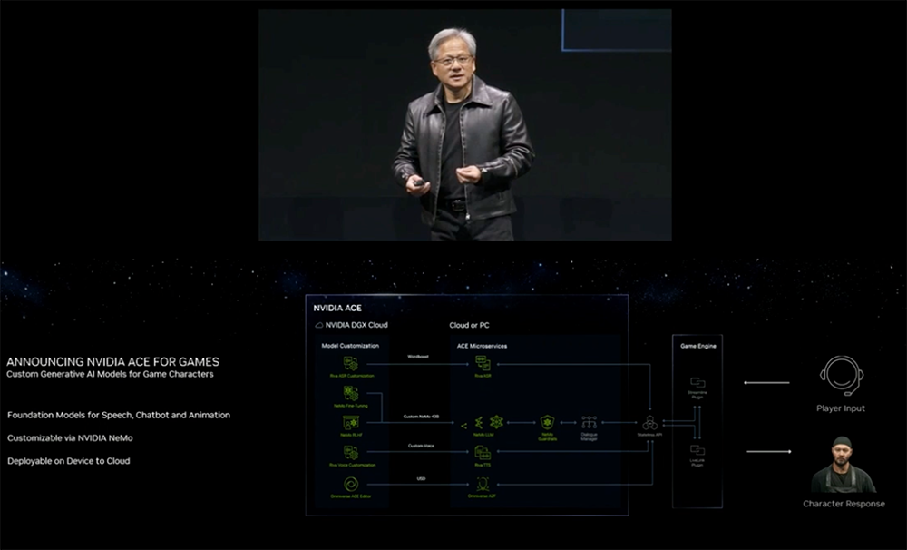 生成式AI将改变玩家与游戏角色间的互动方式,并极大提高游戏的沉浸感。对此,黄仁勋宣布推出面向游戏的NVIDIA Avatar云引擎(ACE)。