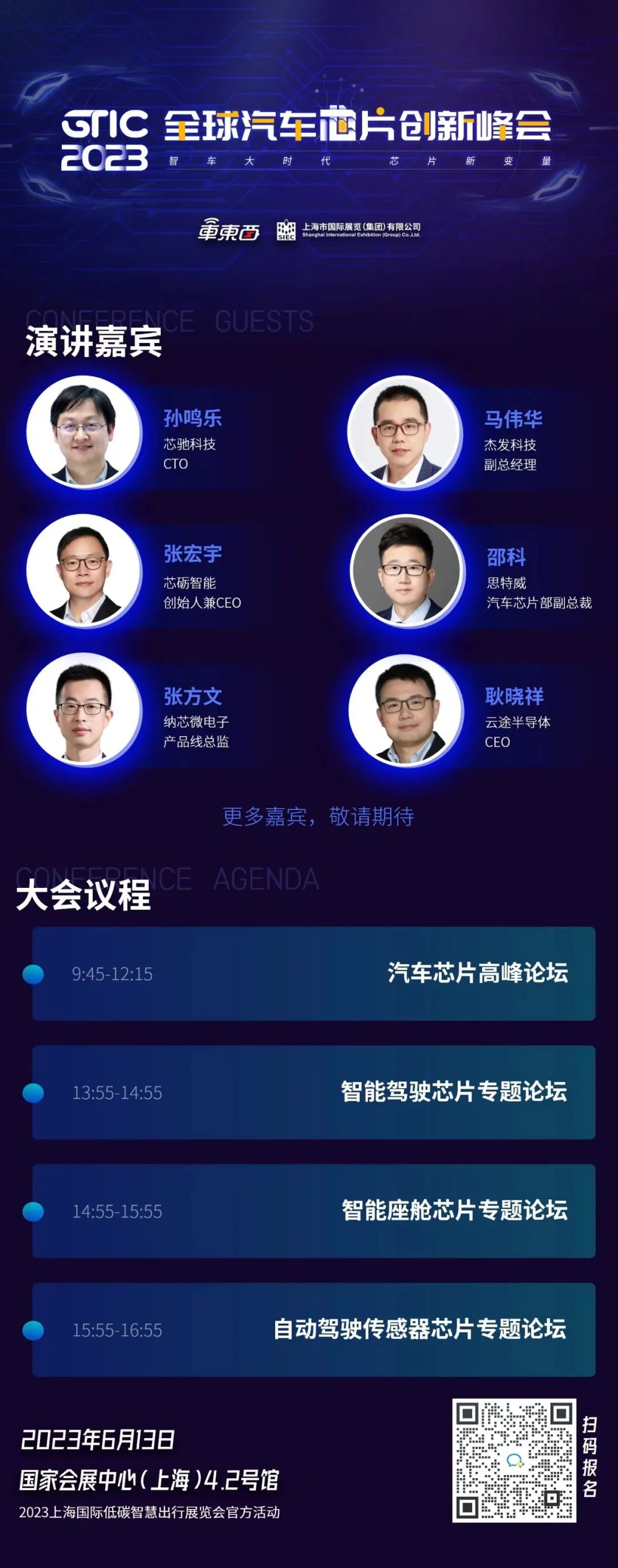 6月13日,GTIC 2023全球汽车芯片创新峰会将在上海国际低碳智慧出行展览会同期举办,首批演讲嘉宾已揭晓,欢迎报名。