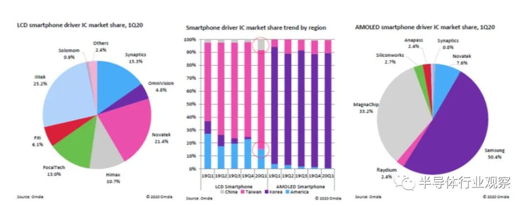 大部分Fabless IC供应商其实都是将生产委托给芯片制造商(Foundry),Foundry利用200mm晶圆,生产IC。因此,由于驱动IC无缘于最尖端的工艺,很难预测是否会通过投资新设备扩充产能,仅靠200mm的Foundry 产线,可利用的产能有限。近年来,由于利用200mm晶圆生产的、用于5G通信的PMIC等的需求猛增,而廉价、利润率较低的驱动IC的生产却丧失了优势、且无法确保产能。如今,虽然驱动IC价格便宜,但由于订单量庞大,被Foundry当作是闲散时期生产的产品,因此Foundry也没有对客户(驱动IC供应商)提出涨价的要求。但是,2017年以后,由于以上理由,导致200mm晶圆出现了产能不足的迹象,结果,导致价格持续上涨。由于2020年新冠肺炎的影响,PC液晶屏、笔记本电脑的需求增加,另一方面,8月份以后由于驱动IC供给不足,PC液晶屏、笔记本电脑的生产一度陷入困境。因此,为了解决以上问题,驱动IC价格在一定程度上保持了上涨,Foundry即使使用300mm晶圆生产驱动IC,也需要确保盈利,因此在Foundry的达到盈利之前,驱动IC的价格会持续上升。但是,由于韩国两大面板厂家连续停产液晶面板产线,因此韩国的驱动IC厂家的生产能力没有大问题,反而他们正在积极扩大针对中国面板厂家的销售,以填补因韩国面板厂家撤退而带来的空缺。另一方面,台湾驱动IC厂家的生产情况却十分糟糕!用于OLED智能手机的驱动IC--韩国厂家的市场占有率达九成