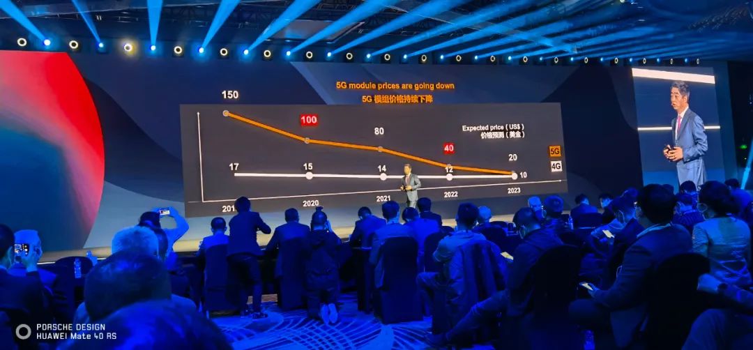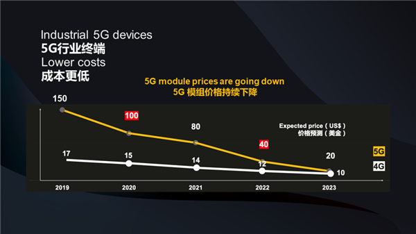 今年双十一期间,中国移动向市场提供了799元人民币的5G模组,这是一个非常积极的信号。华为预测,到2020年底,5G模组价格将降低到100美元左右,到2022年底进一步降低到40美元左右。