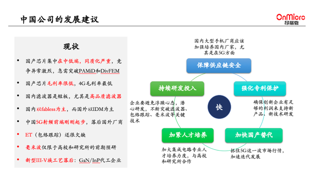 一是国内大型手机厂商应该加强培养国内厂家,尤其是在5G方面;二是企业要避免浮躁心态,潜心研发,不断突破滤波器、包络跟踪、毫米波等关键技术;三是确保创新企业有足够的利润来支持新产品、新技术研发;四是加大集成电路专业人才培养力度,与高校和研究所合作;五是抓住5G这一波市场行情,加速迭代发展。
