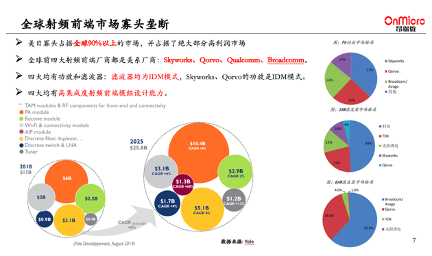 射频前端属于巨头独占的市场,美日寡头占据全球90%以上的市场,并占据了绝大部分高利润市场。