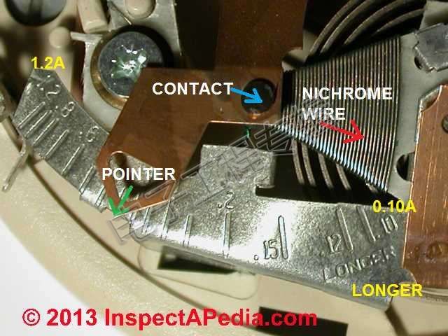 该加热器是缠绕在绝缘体上的镍铬合金(nichrome)线,藉由系统导线的24 VAC自供电(是一种能量采集方法),因位置固定所以能为双金属带加热。