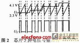 芯片5脚电位U5与输出电位U2对应关系如图2所示。芯片1脚电位U1变化时(U1与标准电压5.05 V不相等时),U5则相应成比例变化,U5与晶振产生的锯齿波经过PWM运算放大器的比较,输出高电平或低电平,然后经过内部逻辑电路运算控制开关管的导通或关断,从而控制U2。因此随着U5的变化,输出开关管的开关时间也就不同,即U2的占当比发生变化,从而控制输出电压的大小。当U1降低时,U5升高,同时控制U2的占空比升高,平均值增加,所以输入U1与输出U2成反比变化。因此在芯片外部增加负反馈电路就可以形成稳定的电源。