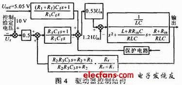 由上述可知驱动器控制系统各部分的传递函数,当PWM输出接LC滤波器时,可以得到其总体控制结构如图4所示。