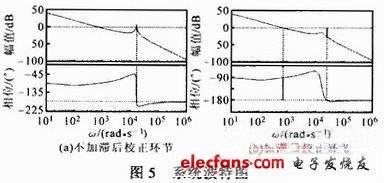 滤波器内阻Rin=0.1 Ω时,负载电阻R=10 Ω,L=190μH,C=20μF时系统开环波特图如图5所示,其中图5a为系统不带滞后校正环节时的波特图,图5b为滞后校正后的波特图。由图可知,经过滞后校正系统变稳定,且相角裕度比较大。