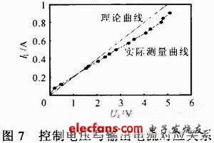 采样电阻为0.25Ω,当改变控制电压时,输出电流应该相应地线性变化,即,IL=0.2Uc。通过实验测得的控制电压与输出电流的对应数据如图7所示。实际对应关系为:IL=0.167Uc+0.043,由实验结果可知实际的控制电压与输出电流对应关系的趋势基本相同。考虑到电路中实际电路参数以及偏差电压的误差,因此该结果完全正常。