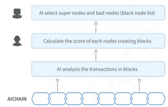 AICHAIN 利用 AI 机器学习方式来对历史的区块数据进行统计分析,来决策挑选出超级节点,采用POA+POW 混合的共识机制。分析挑选的过程如下: