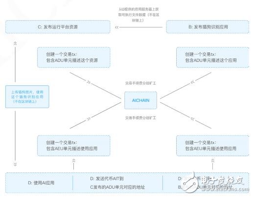 对于 AI 应用平台,除了考虑到数据价值的重要性,还需要包含开发者的软件、具备运行 AI 应用的平台资源(具备大量显卡服务器)和消费者。最终各方都是交易这些资源再应用到 AI 应用系统里,AICHAIN 是将数据、软件、运行平台资源等以数字化的资产发布到区块链上,利用去中心化的数据资产交易平台 DAE 提供信息发布渠道和促进资源互通流转,形成一个 AI 应用交易和产品定制组合平台。